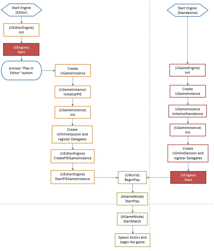 以上内容是引擎中比较基础、也最常用到的元素,通过这些元素我们就可以构建出一个基础的虚拟世界,作为开发者当然还是需要从程序设计的角度理解UE4引擎的基础框架。游戏启动的流程图(来自官方):Unreal Engine API Reference